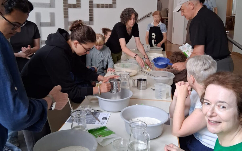 Während der Teig ruhte, widmeten wir uns dem Lernen. Wir studierten Quellen aus Tora, Mischna und Midrasch und gingen gemeinsam der Bedeutung von Brot in der jüdischen Tradition nach. Die lebhaften Gespräche verbanden die praktische Arbeit des Backens mit der spirituellen Weisheit unserer Texte.